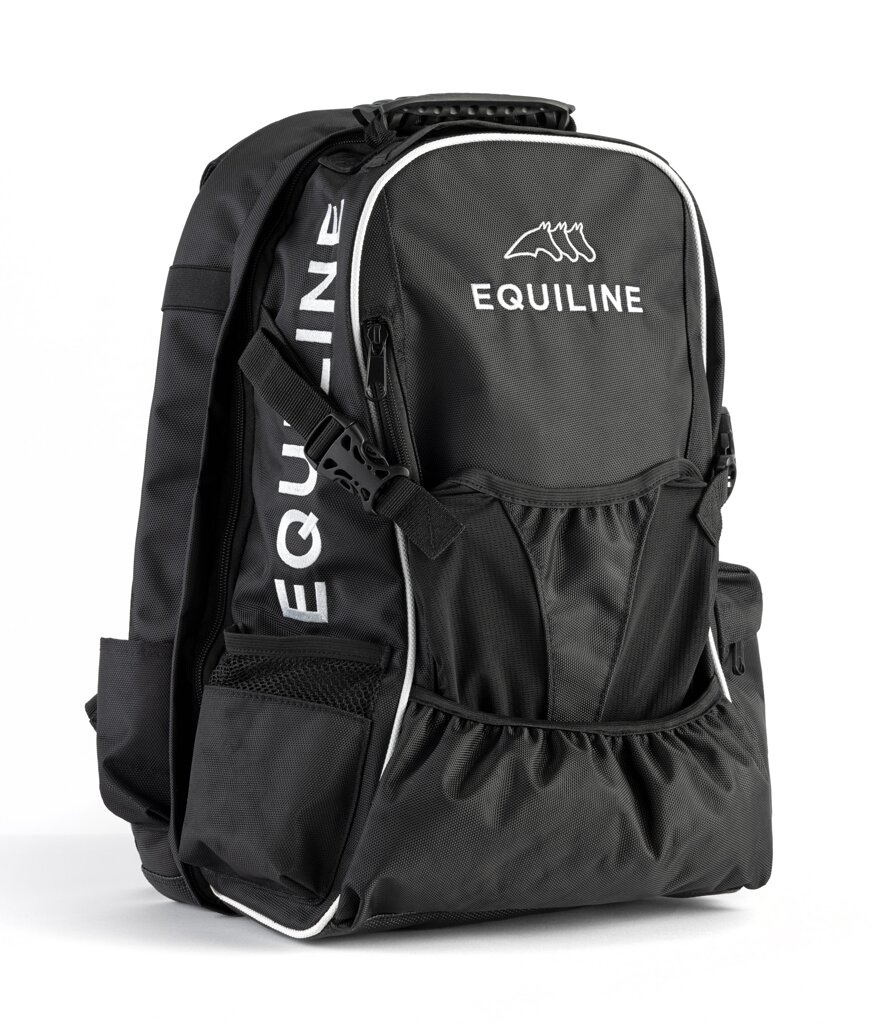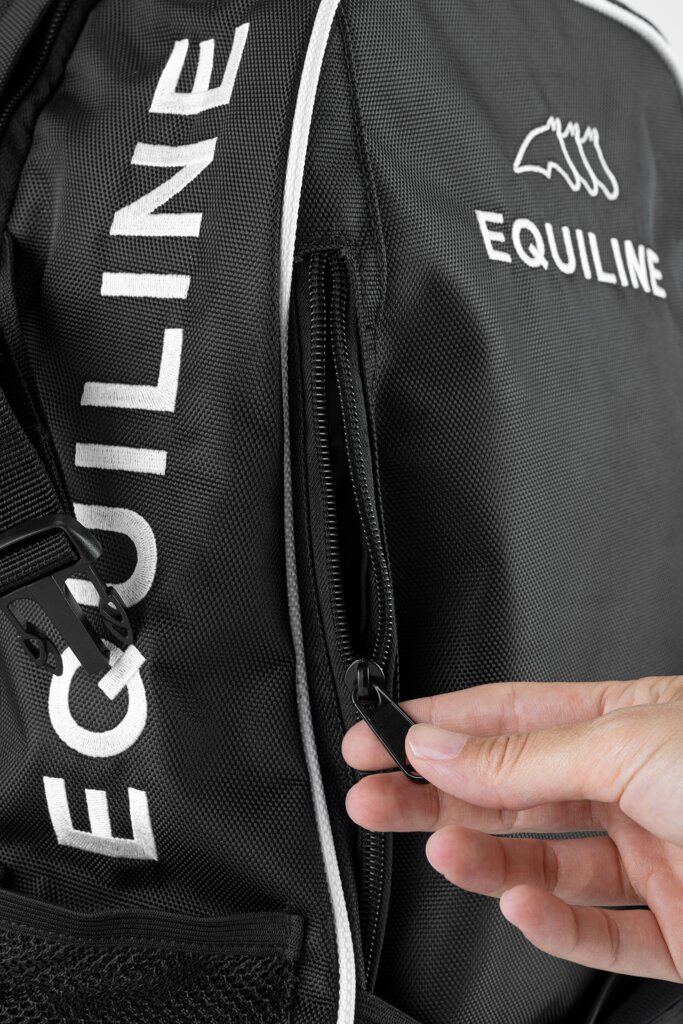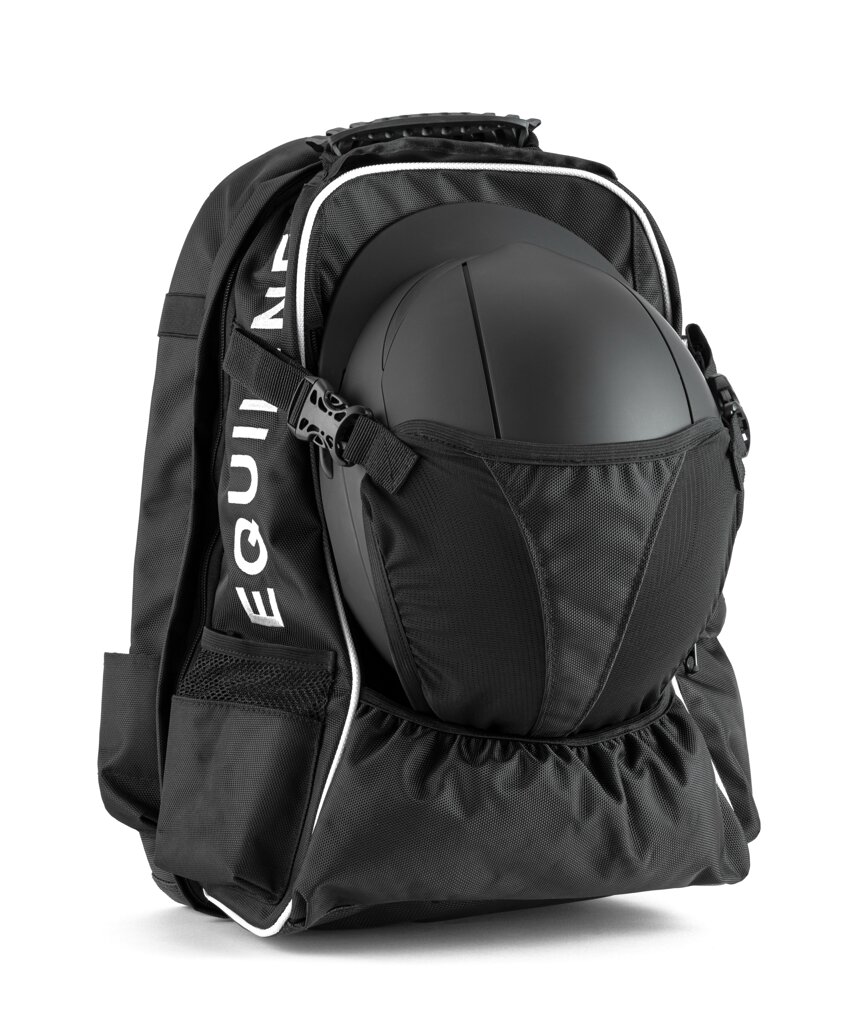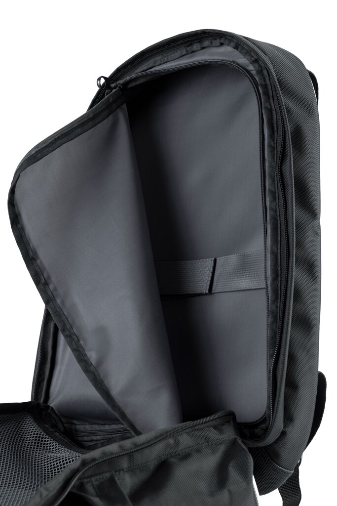 Cestovní batoh z pevného nylonu s ergonomickou rukojetí, multifunkčními kapsami, měkkým polstrováním zad z prodyšné síťoviny a odnímatelným držákem na přilbu ve přední části.