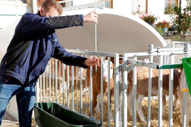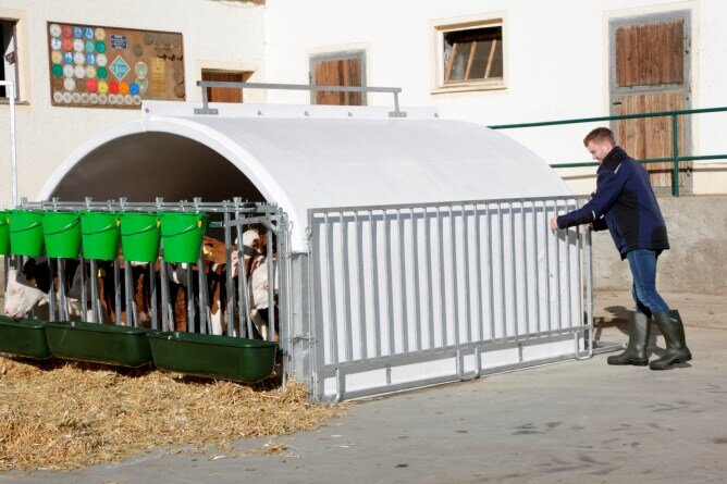 Doplňkový výztužný rám kolem přístřešku pro telata garantuje maximální stabilitu i u větších zvířat.