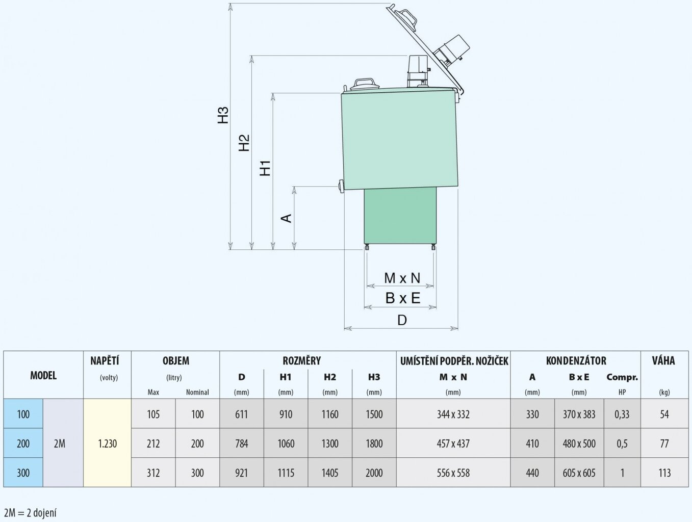 - otevřený chladící tank o objemu 100, 200 a 300 litrů