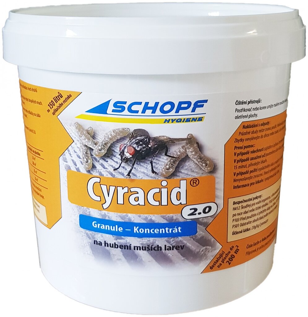 Cyracid 2.0 je ve vodě rozpustný granulát určený k regulaci výskytu much v chovech hospodářských zvířat. Působí jako regulátor růstu hmyzu – přerušuje vývojový cyklus much ve stadiu larev, čímž účinně omezuje jejich další množení. Nemá vliv na dospělé mouchy, ale dlouhodobě snižuje jejich výskyt v provozu. Přípravek je vhodný pro použití ve stájích skotu, prasat, drůbeže, koní i telat. Lze jej aplikovat i v obsazených stájích. Nejlepších výsledků se dosahuje při pravidelném a preventivním používání.