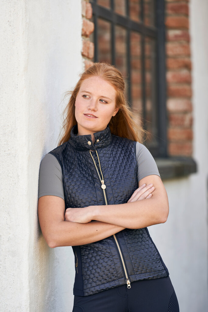 Dámská sportovní vesta z kolekce Covalliero je přesně pro vás, pokud dáváte přednost funkčnosti a volnosti pohybu. V oblasti boků je elastický materiál, který krásně obepne tělo, tělo vesty je vyrobeno z elastického prošívaného materiálů beze švů. Dvě skryté boční kapsy se zapínáním na zip udrží vaše cennosti v bezpečí aniž by vypadly. Vesta je skvělá jak při jízdě na koni, tak i na volnočasových aktivity