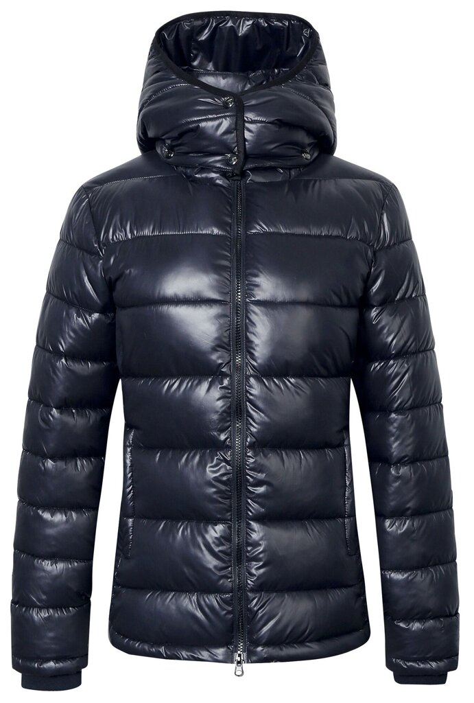 Dámská prošívaná bunda s vypasovaným střihem, odnímatelnou kapucí pomocí druků, obousměrným zipem, dvěma kapsami se zapínáním na zip a náplety na rukávech jako ochrana proti vniknutí větru do rukávu, na zadní zadním díle je ve stejném tónu vyšit nápis Cavalliero.