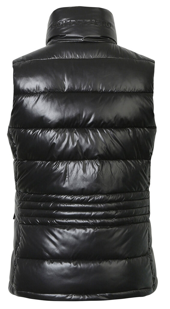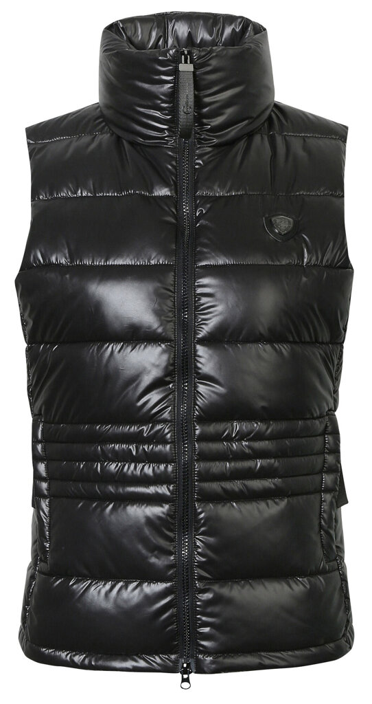 Dámská prošívaná vesta z jemně lesklého materiálu s vysokým límcem, vypasovaným střihem, obousměrným zipem a 2 kapsami se zapínáním na zip.