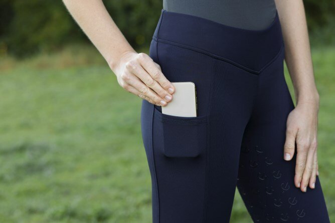 Dámské jezdecké legíny se středně vysokým pasem z utra elastického mikrovlákna s extra širokým pohodlným pasem, praktickou kapsičkou na mobil a silikonovým potiskem po celém sedu ve tvaru loga Covalliero.• leginy z ultra elastického materiálu