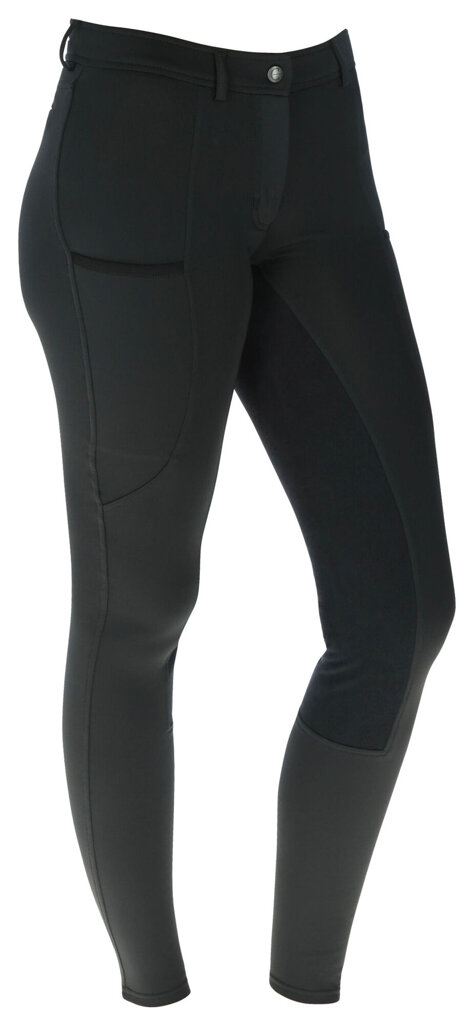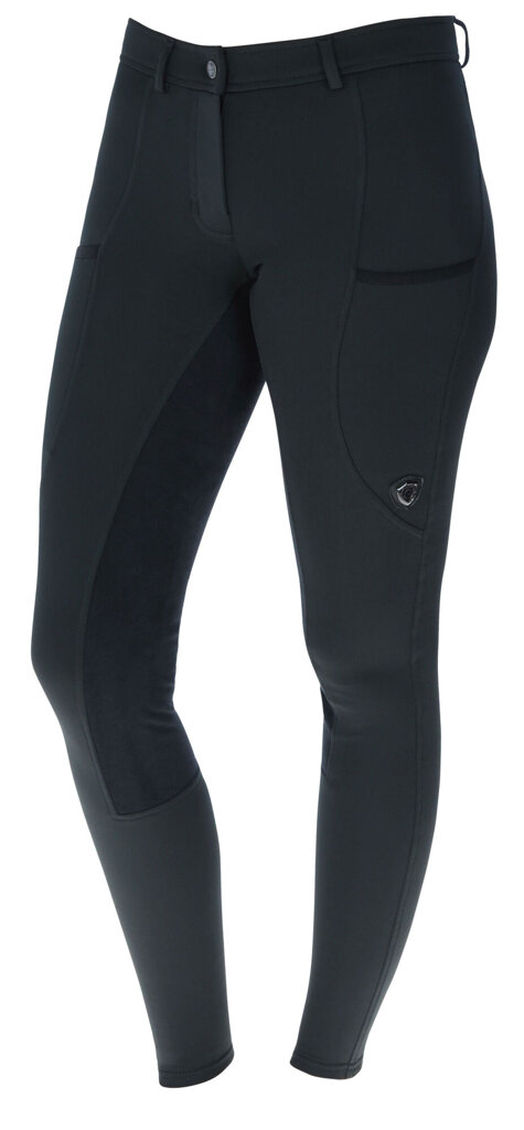 Dámské jezdecké rajtky s celokoženým sedem, z vysoce elastického, prodyšného softshellového materiálu s fleecovou počesanou vnitřní stranou, komfortním pasem s poutky na pásek, dvěma bočními kapsami pro mobil.