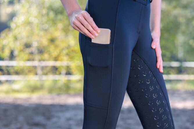 Klasické celoroční jezdecké kalhoty z ultraelastického mikrovlákna, silikonovým potiskem ve tvaru loga Covalliero po celém sedu a praktickou kapsičkou na mobil.• vysoce elastický material