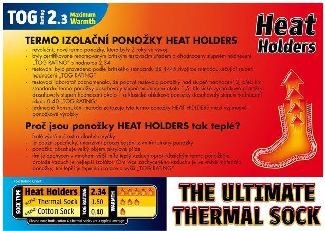 2 roky vývoje a certifikace renomovaným britským testovacím úřadem. Ohodnoceny stupněm „TOG RATING“ 2,34, testovaným dle britského standardu BS 4745. Standardní TERMO ponožky mají stupeň hodnocení „TOG RATING“ okolo 1,5, klasické oblekové ponožky mají stupeň 0,40. Jedinečná konstrukce úpletu a následné zušlechtění řadí tyto termoponožky HEAT HOLDERS mezi výjimečné výrobky.
