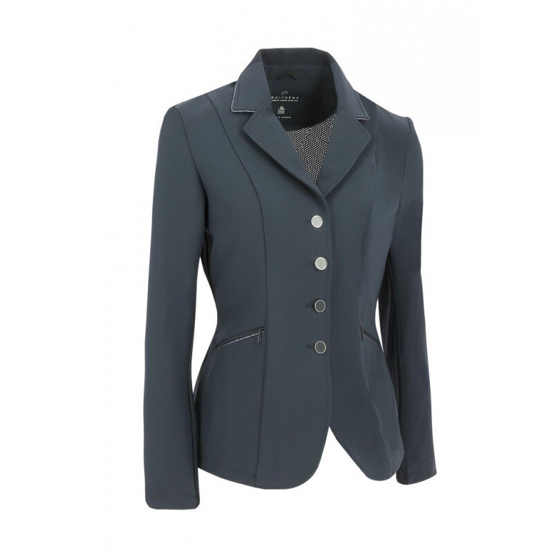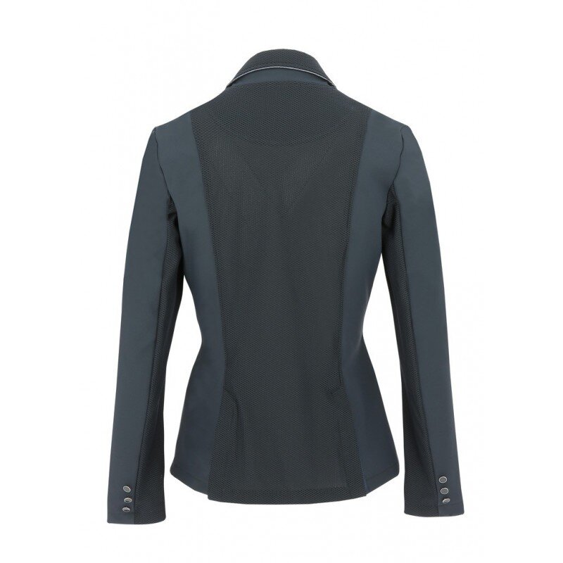 Dámské závodní sako EQUITHEME Oliva je vyrobené z voděodolného, prodyšného a elastického materiálu. Sako je velice vzdušné díky perforovanému, síťovanímu materiálu na zádech a rukávech. Díky tomu je velice pohodlné a umožní jezdci neomezený pohyb. Sako se zapíná pomocí knoflíků, po stranách jsou kapsy, které jsou stejně jako límec zdobeny decentním lemem z flitrů.