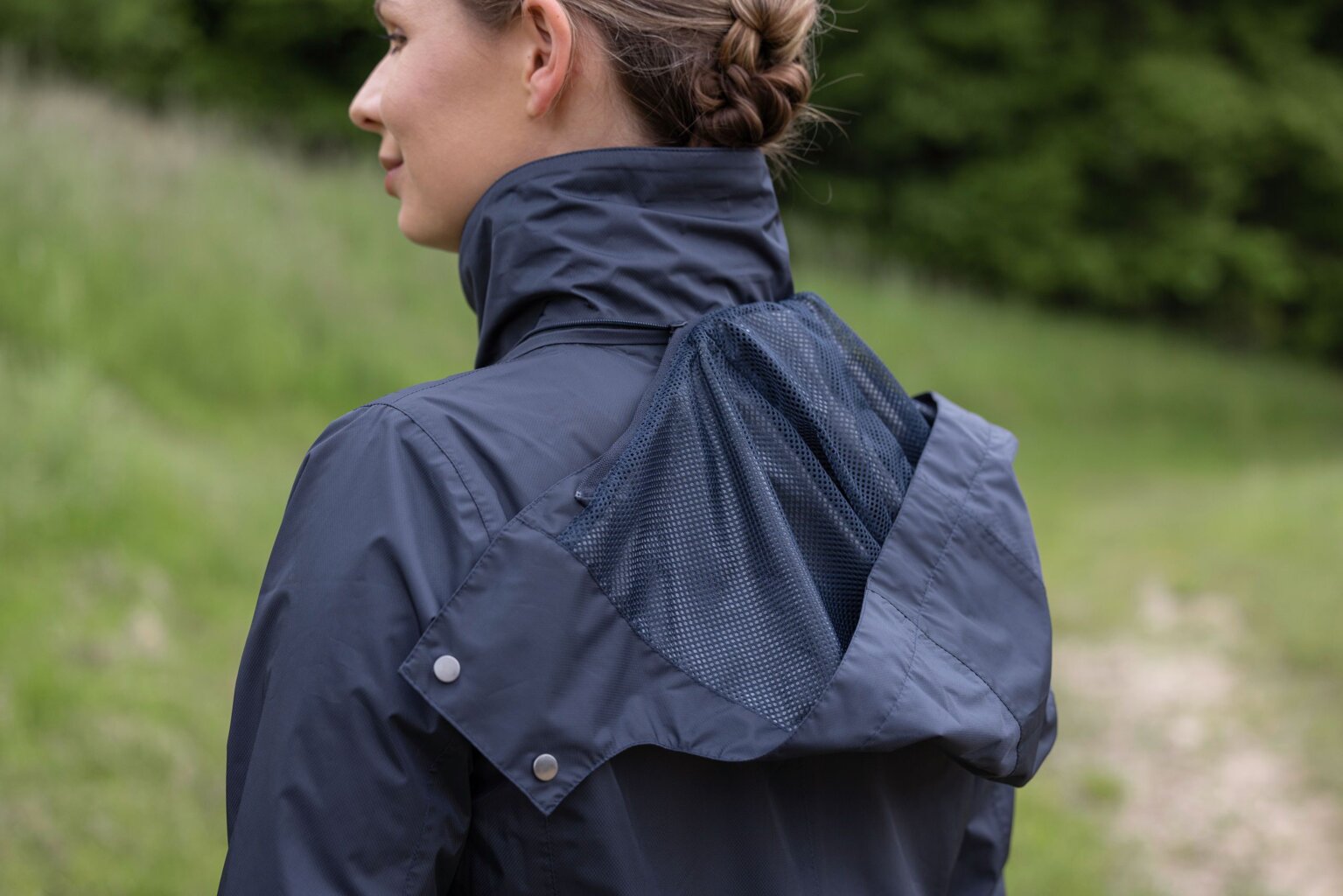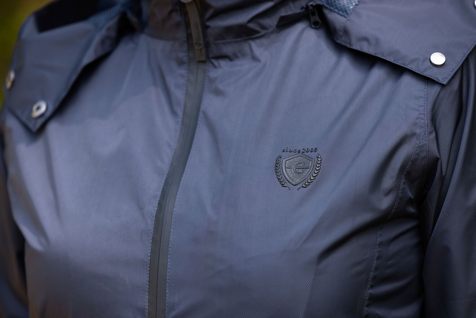 Lehký, sportovní, jezdecký kabát s vypasovaným střihem, odnímatelnou kapucí, která se dá vepředu zapnout na 2 druky a tvoří kryt přes vysoký límec. Obousměrný zip a rozparek v zadní části se zapínáním na druky zajistí maximální pohodlí v sedle. Po stranách jsou 2 kapsy se zapínáním na klasický zip. Rukávy jsou zakončeny manžetou s gumou. Vše doladí logo Covalliero přední straně.