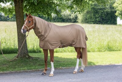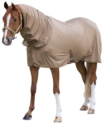 Lehká, prodyšná síťovaná deka proti hmyzu včetně krku. Krk se dá jednoduše odejmout, deka perfektně sedí díky svému střihu a jako pojistka je tu křížové zapínání pod břichem, aby se deka nemohla přetočit.