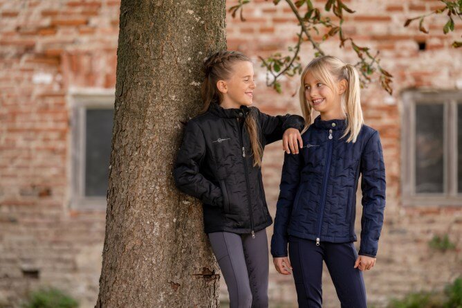 Lehká, sportovní, kombinovaná dětská bunda z elastického materiálu po bocích a prošívaného polyesteru. Bunda má stojáčkový límec s páskem na druk, obousměrný zip, 2 boční kapsy se zapínáním na zip a výšivku Covalliero na pravé straně.