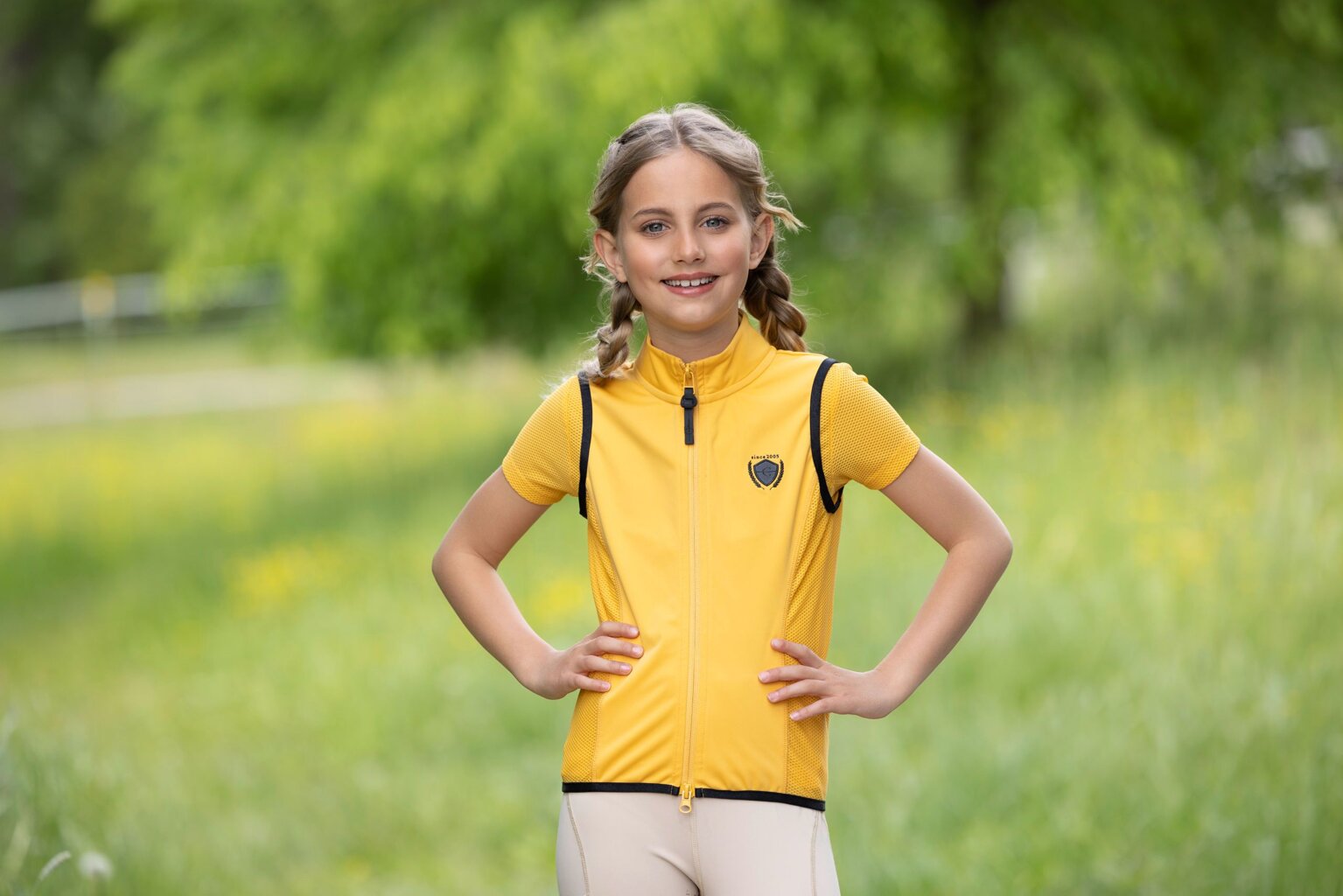 Super lehká, sportovní, jezdecká vesta s vsazeným síťovaným materiálem po bocích. Tuto vestu si zamilujete díky její lehkosti, prodyšnosti a možnosti volného pohybu. Průramky a spodní díl vesty je olemován elastickým materiálem v kontrastní barvě. Díky elastickému lemování krásně přilne k tělu.