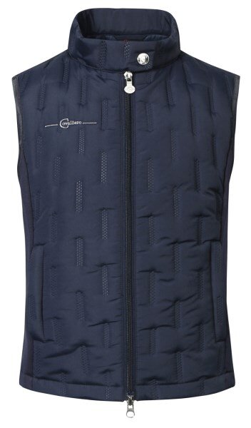 Lehká, sportovní, kombinovaná dětská vesta z elastického materiálu po bocích a prošívaného polyesteru. Vesta má stojáčkový límec s páskem na druk, obousměrný zip a výšivku Covalliero na pravé straně.