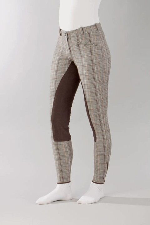 Stylové dětské jezdecké kalhoty s moderním kostkovaným vzorem s celokoženým sedem ( imitace kůže ) Kalhoty jsou vyrobeny z vysoce elastického materiálu, jsou příjemné na nošení.