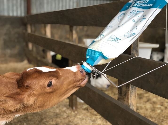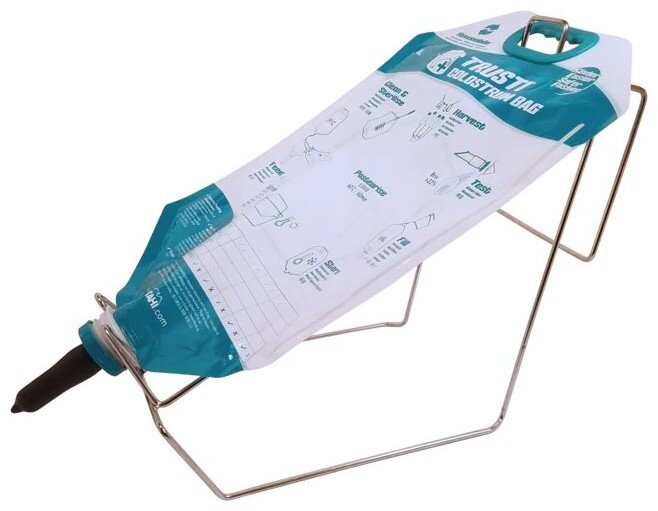 - držák pro uchycení sáčku na mlezivo přesně ve výšce stojících telat