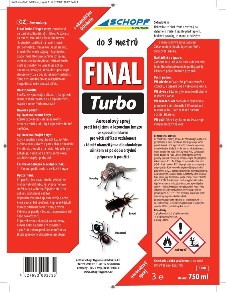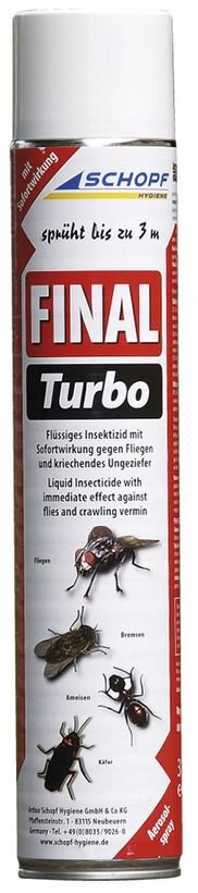 Final Turbo Spray je insekticid připraven k použití na bázi několika účinných látek. Vyznačuje se okamžitým hubicím účinkem do 20 minut na létající a lezoucí hmyz jako jsou švábi, mravenci, rybenky, brouci, roztoči, pavouci, blechy, moli, mouchy, komáři, vosy a další. Používá se v prázdných skladech, hangárech, silech, v domácnosti a v hospodářství, ve stájích a komerčních prostorách. Díky speciálnímu stříkacímu mechanismu lze dosáhnout stříkací vzdálenosti až 3m. To usnadňuje aplikaci i na místa, která jsou těžko dostupná, např. stropních rozích, za a pod skříněmi a v šachtách. Sprej není vhodný pro aplikaci přímo na hospodářská nebo domácí zvířata.