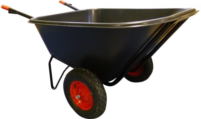 Kovová kontrukce kolečka je doplněna korbou z odolného plastu a dvěma nafukovacími koly.