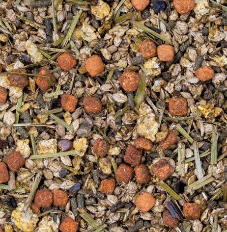 Složení: kukuřičné vločky, ječné vločky, vojtěška, Svatojánský chléb, třtinová melasa, ječmen, extrahované slunečnicové semeno, kukuřice pukaná, pšenice krmná, slunečnicový olej,pivovarské kvasnice, uhličitan vápenatý, fosforečnan vápenatý, bylinné rostliny (kopřiva, island. mech, ibišek, kostival, petržel, podběl, libeček), chlorid sodný, dextróza