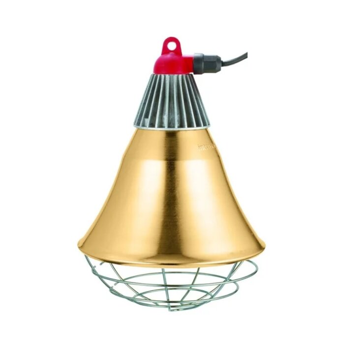 Infrazářič Interheat pro ohřev selat a drůbeže s chladičem patice žárovky. V drobném chovu může nahradit umělou kvočnu.