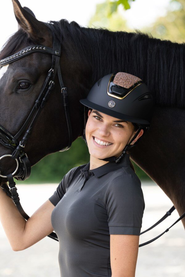Elegantní jezdecká helma Covalliero Elite Polo v luxusním provedení pink gold spojuje moderní design s maximální bezpečností. Díky polo kšiltu působí stylově a zároveň poskytuje praktickou ochranu před sluncem.