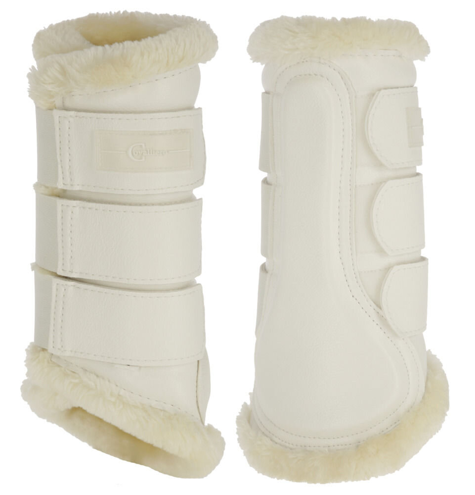 Chrániče na přední nohy s anatomickým střihem, z odolné syntetické kůže, zapínáním na suchý zip a měkkým umělým beránkem uvnitř.