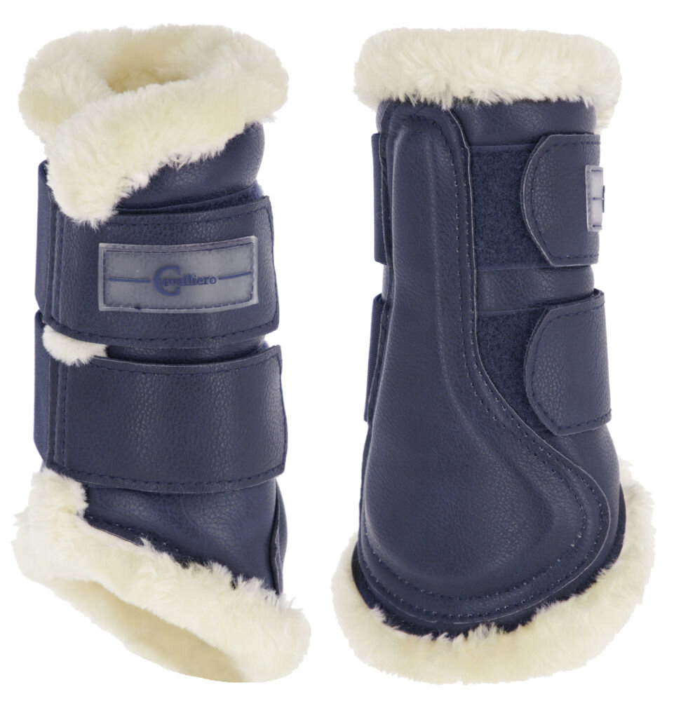Chrániče na přední nohy s anatomickým střihem, z odolné syntetické kůže, zapínáním na suchý zip a měkkým umělým beránkem uvnitř.