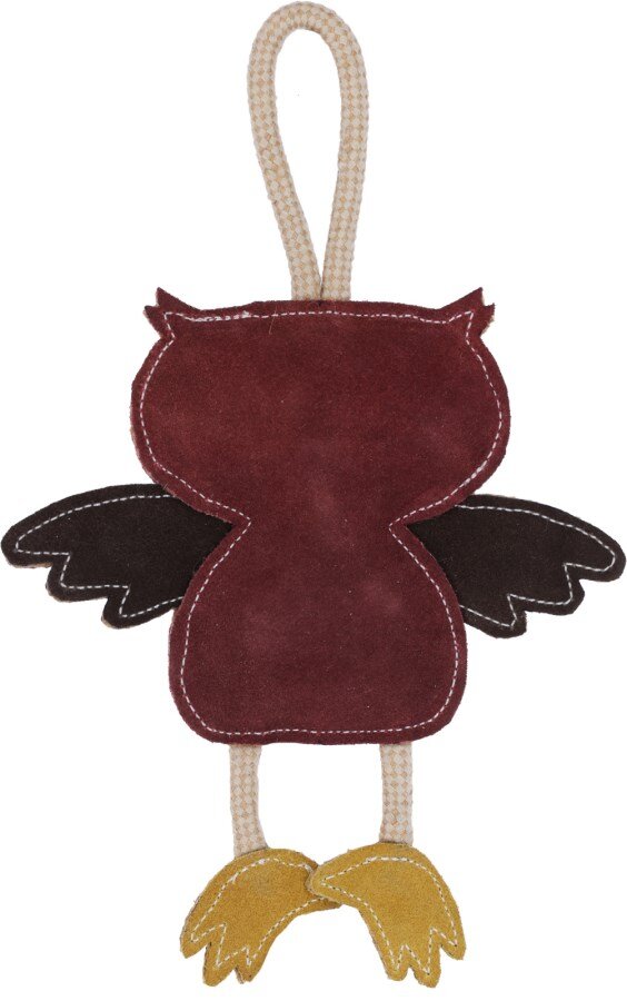 Hračka pro psy z odolné semišové kůže, vyplněna přírodním kokosovým vláknem s integrovaným lanem pro zavěšení.