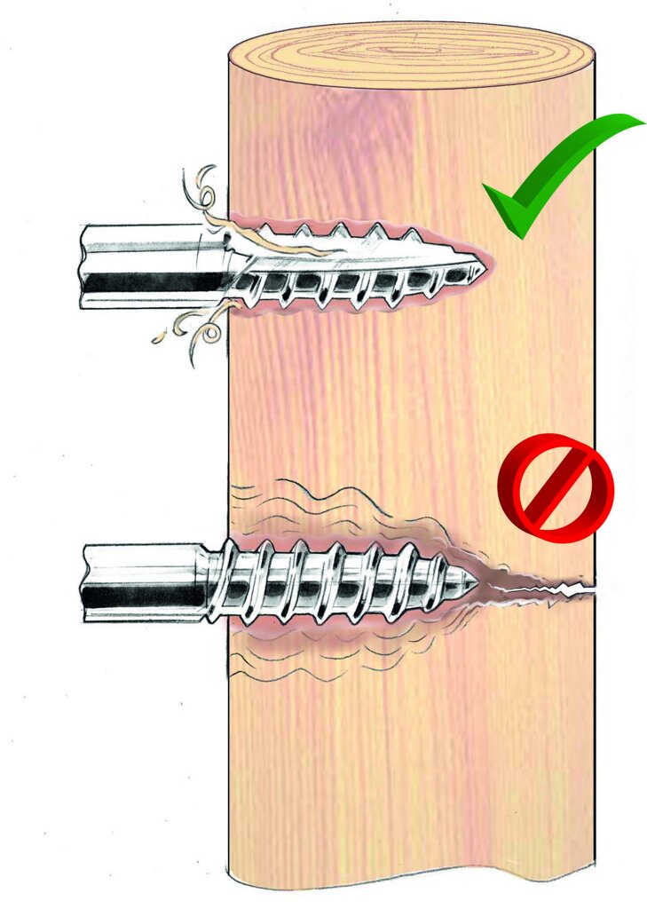 • vrut s průměrem 6 mm se samořezným závitem (dřevo nevytlačuje, ale řeže)