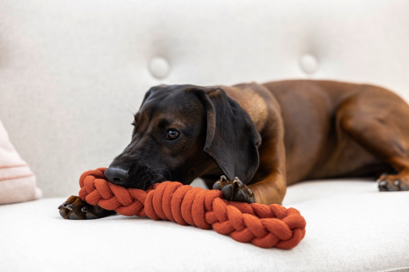 Odolná lanová hračka pro psy ve tvaru osmičky je ideální pro přetahování, aportování i samostatnou zábavu. Vyrobená z pevného bavlněného lana, které vydrží kousání a zároveň pomáhá čistit zuby a masírovat dásně během hry.