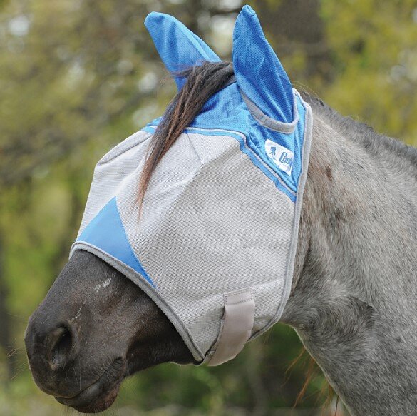 Vysoce komfortní maska proti hmyzu s ochranou uší. Maska poskytuje kvalitní ochranu před mouchami, komáry, pylem létajícího hmyzu a bahnem. Speciální patentovaný design umožní koni nerušený výhled, nepadá z hlavy, poskytuje 70% UV ochranu.