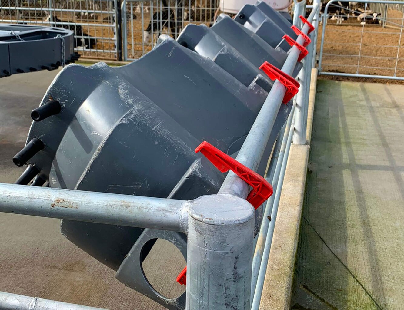 - Instalace: Zavěste krmítko pomocí Ezi Lock háčků na zábradlí nebo branku ve výšce přibližně 100 cm, aby byly dudlíky ve výšce 60 cm, což je optimální pro správné uzavření jícnového žlábku u telat.