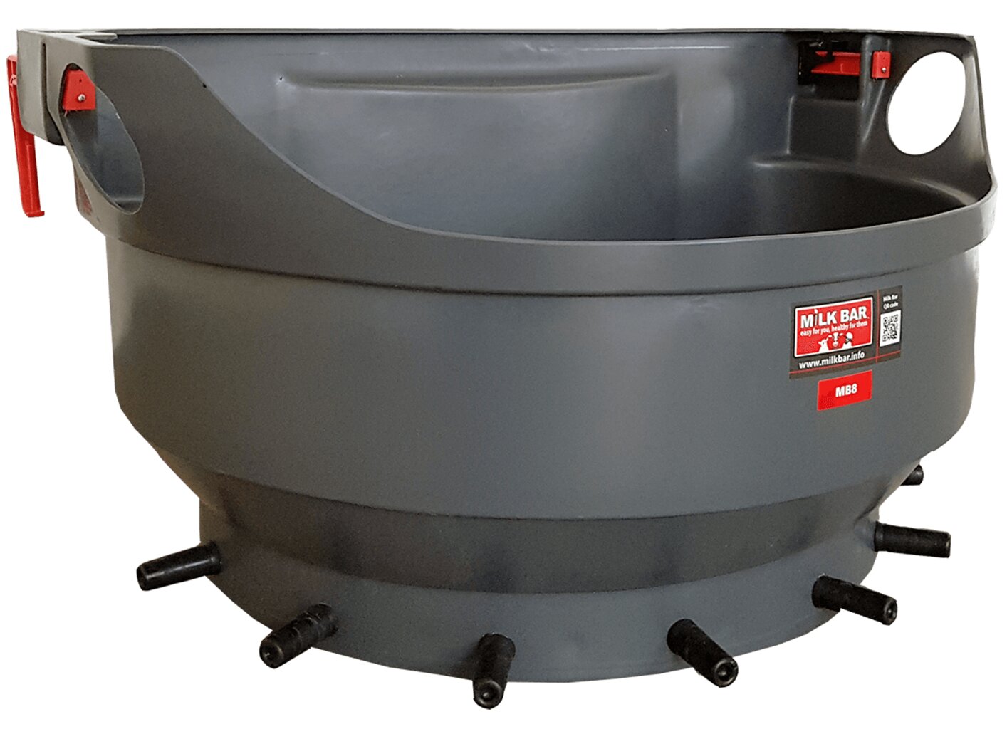 Představujeme krmítko Milk Bar™ XL 8, kód produktu 910330, navržené pro efektivní krmení až osmi telat současně. Toto lehké, ale robustní krmítko je vybaveno háčky Ezi Lock, které bezpečně upevňují krmítko na zábradlí a zabraňují telatům v jeho posunutí. Širší rozestupy dudlíků (13 cm) poskytují dostatek prostoru pro větší plemena a starší telata. Krmítka jsou stohovatelná pro snadnou manipulaci a skladování a jejich otevřený design usnadňuje čištění. Jsou vybavena dudlíky Milk Bar™ pro snížení nežádoucího chování při sání.