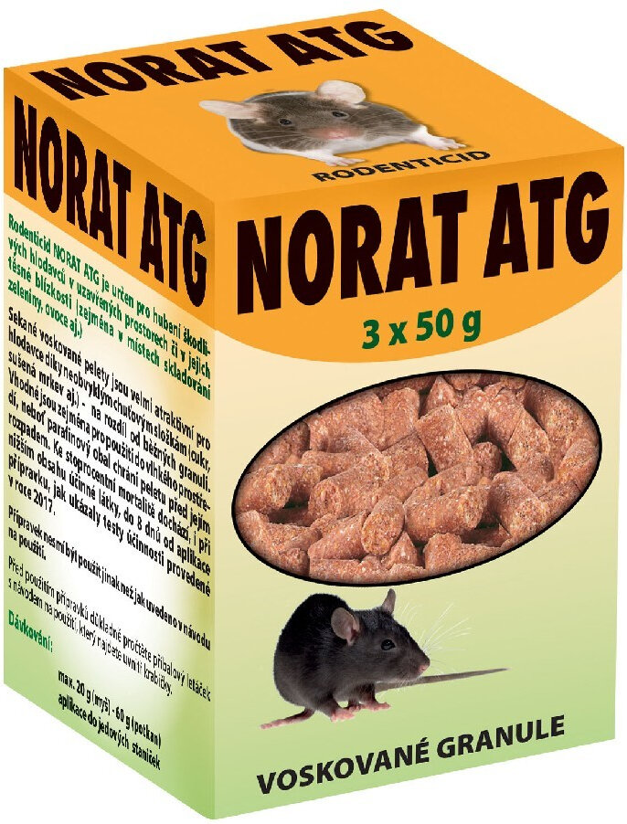 NORAT ATG sekané voskované granule pro hubení škodlivých hlodavců.• k hubení myší a potkanů s neobvyklou chuťí sušené mrkve a cukru