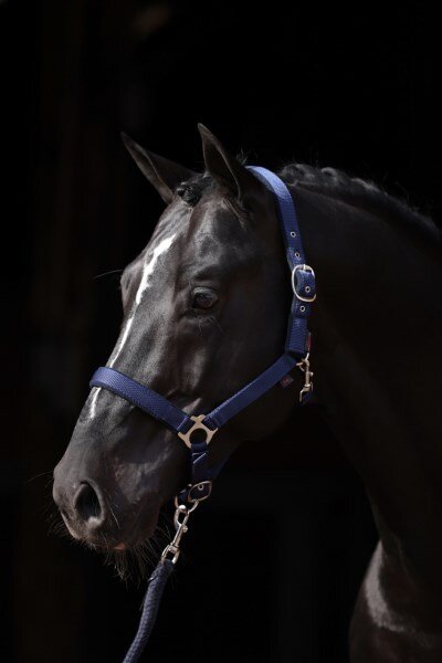 Moderní ohlávka v klasických barvách s možností nastavení nánosníku i nátylníku, podložena fleecem, z pevného materiálu odolnému proti opotřebení se silnými švy a masivním kováním.