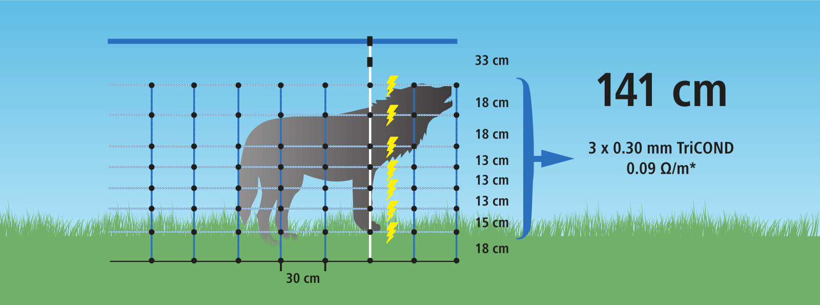 Ohradníková síť proti vlkům WolfNet 141cm/50m/jednoduchý hrot