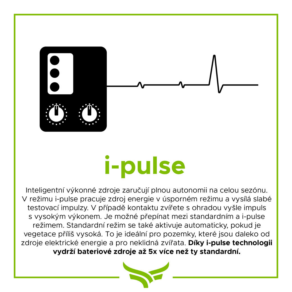 • ochrana - při poklesu napětí, se akumulátor automaticky přepne do ECO režimu, kdy je v činnosti jeden z pěti impulzů