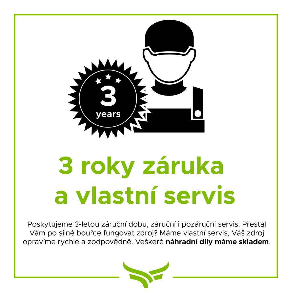 • napájení: 12 V akumulátorem, síťovým zdrojem, nebo solárním panelem 33 W