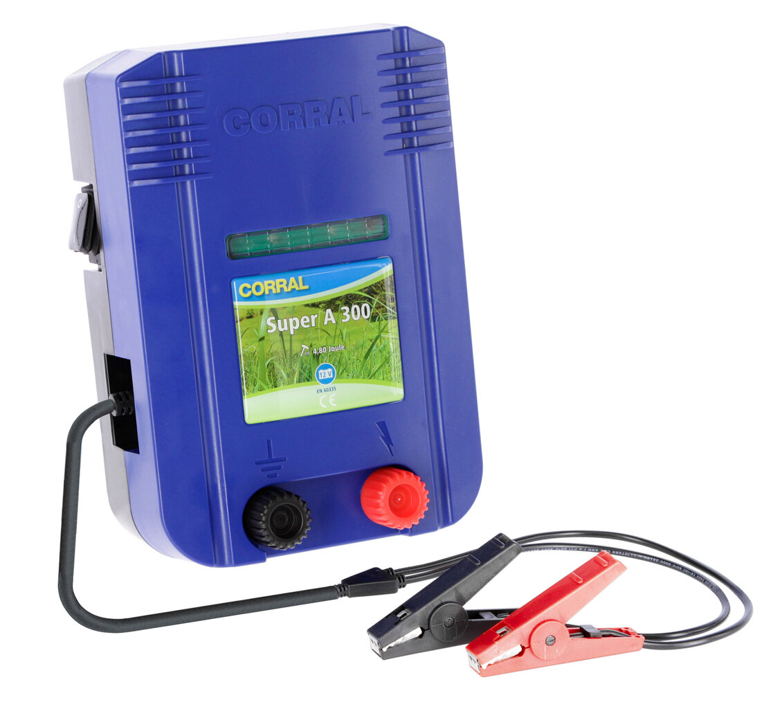 Corral Super A300 je vhodný pro elektrické ohradníky pro skot, koně, ovce i kozy a je napájen 12V akumulátorem, což z něj činí ideální řešení pro místa bez přístupu k elektrické síti.