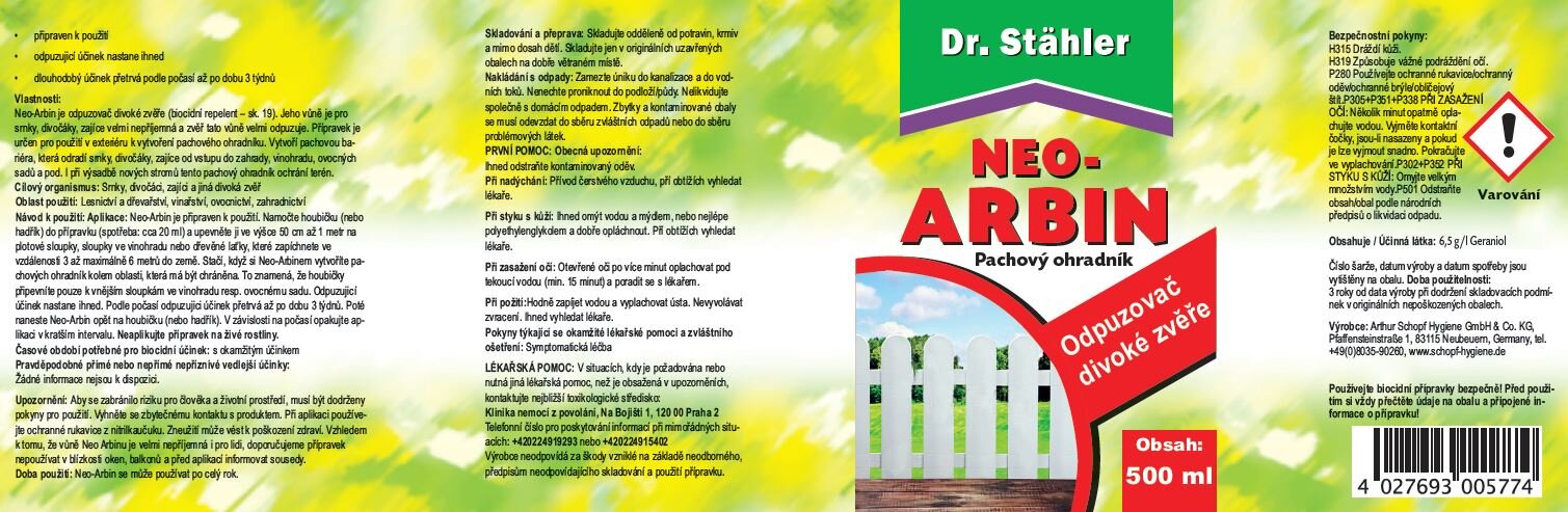Přípravek se nesmí dostat na kůži nebo na živé rostliny. Při aplikaci používejte rukavice. Vzhledem k tomu, že Neo-Arbin voní nepříjemně i pro lidi, doporučujeme přípravek nepoužívat v blízkosti oken, balkonů a před aplikací informovat sousedy.