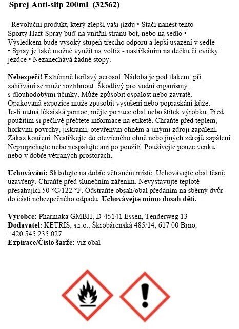 Revoluční produkt, který zlepší vaši jízdu. Stačí nanést tento Sporty Haft-Spray buď na vnitřní stranu bot nebo na sedlo. Výsledkem bude vysoký stupeň třecího odporu a lepší usazení v sedle. Spray je také možné využít na voltiž - nastříkáním na dečku či cvičky jezdce. Nezanechává žádné stopy.• Objem: 200 ml.