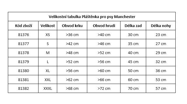 - Délka uvedená v tabulce se vztahuje k délce nohavic pláštěnky.