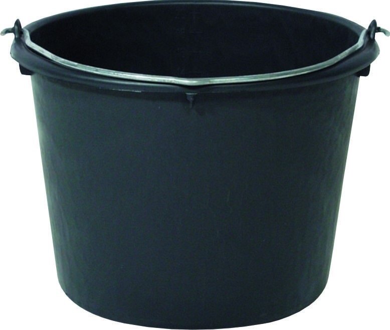 Zednická nádoba s kovovým uchem vyrobena z odolného plastu.