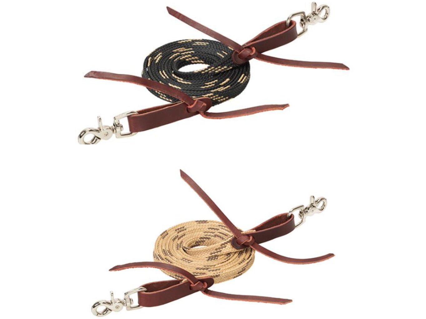 Ploché lanové otěže s voskovanou polyesterovou konstrukcí nabízí skvělý úchop. Otěže jsou zakončeny koženou smyčkou s poniklovanými nůžkovými karabinkami.Délka: cca 2,5 m
