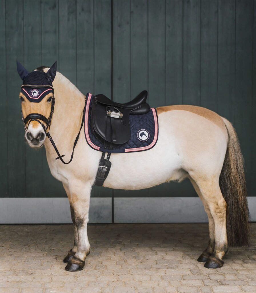 Roztomilá podložka pod sedlo pro nejmenší jezdce a jejich poníky s netradičním srdíčkovým prošitím, třpytivým obšitím a hlavou koně.