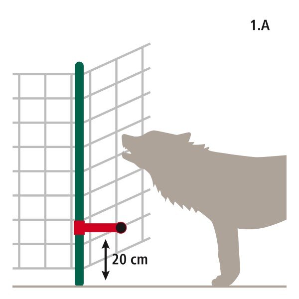 • jako ochrana proti podhrabání = montáž na sloupek 20 cm nad zemí pod úhlem 90° a natažení vodivého lanka (viz obr. 1.A)