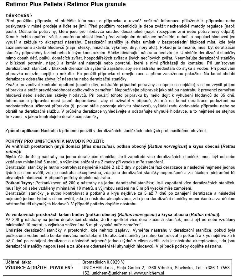 - Myši: až do 40 g nástrahy na jednu deratizační staničku. Je-li zapotřebí více deratizačních staniček, musí být od sebe vzdáleny minimálně 5 metrů, s výjimkou snížení na 2 metry při vysoké míře zamoření.