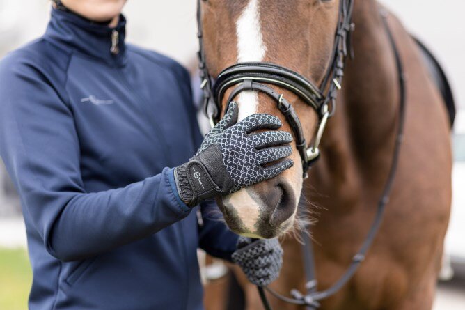 Reflexní jezdecké rukavice• s reflexním potiskem loga Covalliero na hřbetu ruky