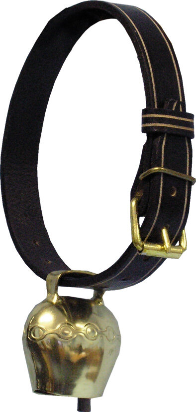 - Kožený řemen pro zvonce z černé kůže zdobený kontrastním prošíváním.