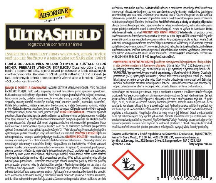 Špičkový americký repelent s pyrethroidy na českém trhu! Opravdu účinný repelent s dlouhotrvajícím účinkem. Hubí a odpuzuje přes 70 druhů hmyzu včetně hovad a klíšťata, která mohou přenášet lymskou boreliózu.UltraShield® EX Insecticide & Repellent se nevypotí, je voděodolný, nemastný a jeho prodloužený účinek, běžně zajišťovaný tzv. slunečními krémy pod různými obchodními názvy, je zde posílen použitím rovnou dvou takových. Obsahuje také výtažky z aloe a lanolinu. Odpuzuje a zabíjí široké spektrum hmyzu, od otravných much a mušek, přes moskyty, komáry, pakomárce (Culicoides), klíšťata, blechy, kloše, muchničky, tiplíky, vši...