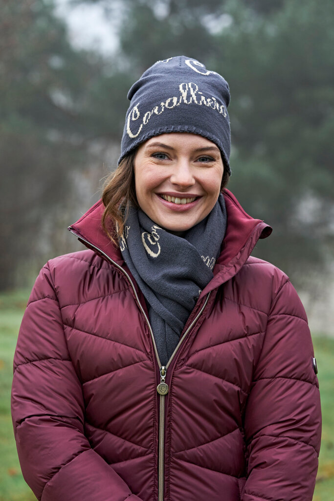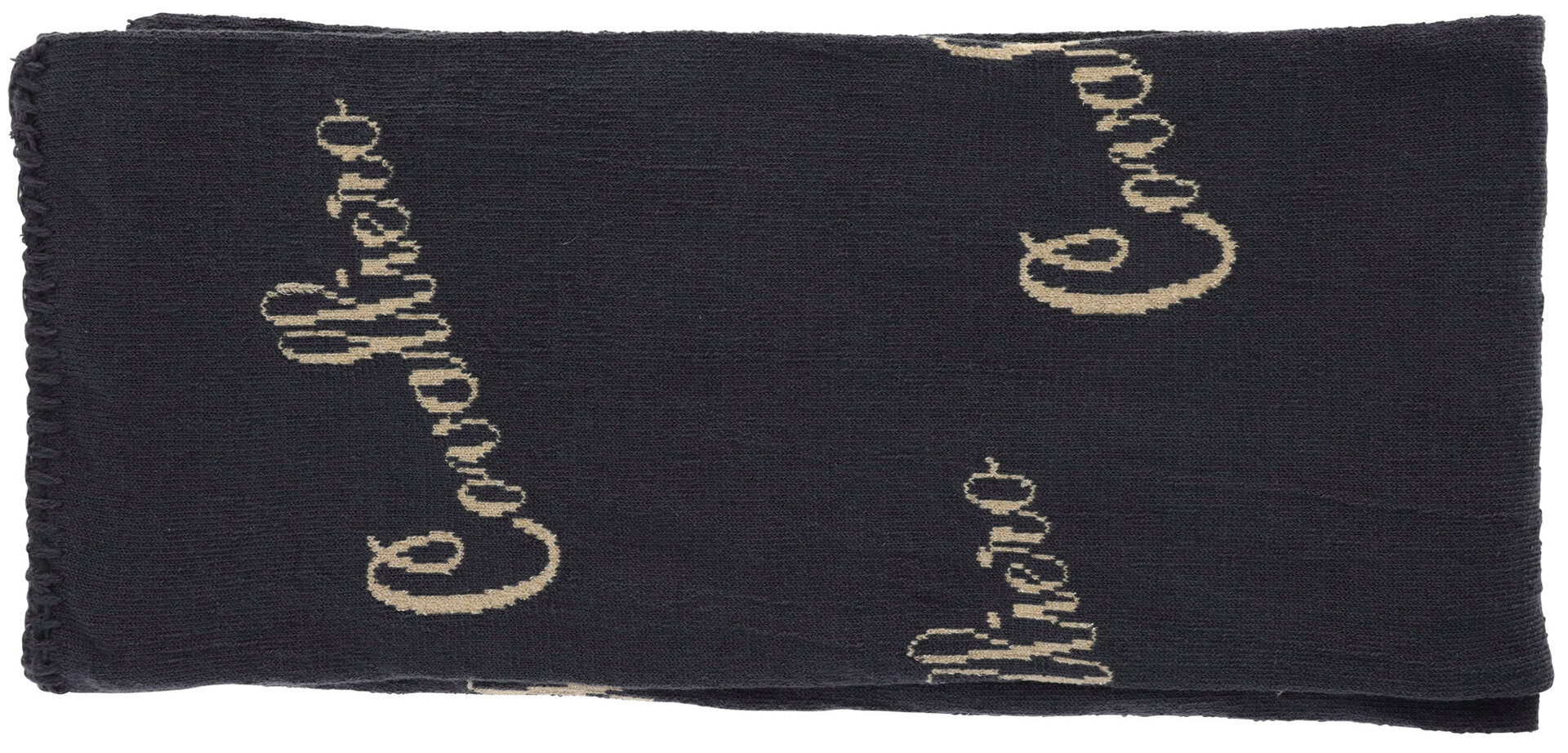 Hřejivá šála s nápisem Covalliero z metalické nitě.